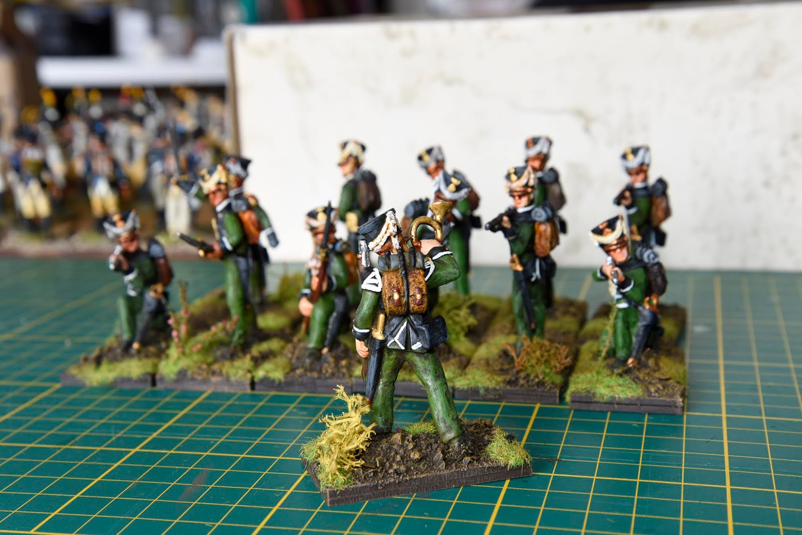 My latest work is a set of HaT Industries 1/32 Wurttemberg Jaegers. I painted ten soldiers, an officer and a bugler! They will be welcome reinforcement for my French troops! I enjoyed painting green uniforms for the first time. I think their uniforms are very handsome and cool to paint!